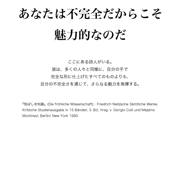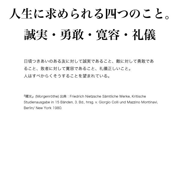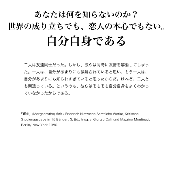 フリードリヒ・ニーチェ:ドイツの哲学者。牧師の仔として生まれる。ギリシア悲劇などの古典文献学を学んだ後、24歳の若さで大学教授となった。ニーチェはギリシア古典に関する深い造詣を背景に、ギリシア哲学における主知主義やキリスト教的世界観など、西洋思想の根幹部分をラディカルに批判し、近代ヨーロッパ世界のあり方そのものに、根本的な問い直しを迫った。しかし40代半ばに精神に変調をきたして哲学者としての活動が困難となり、55歳で死去。